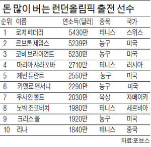런던 올림픽에 출전한 선수 중 ‘테니스 황제’ 로저 페더러(스위스)가 최근 1년간 가장 돈을 많이 번 것으로 나타났다.