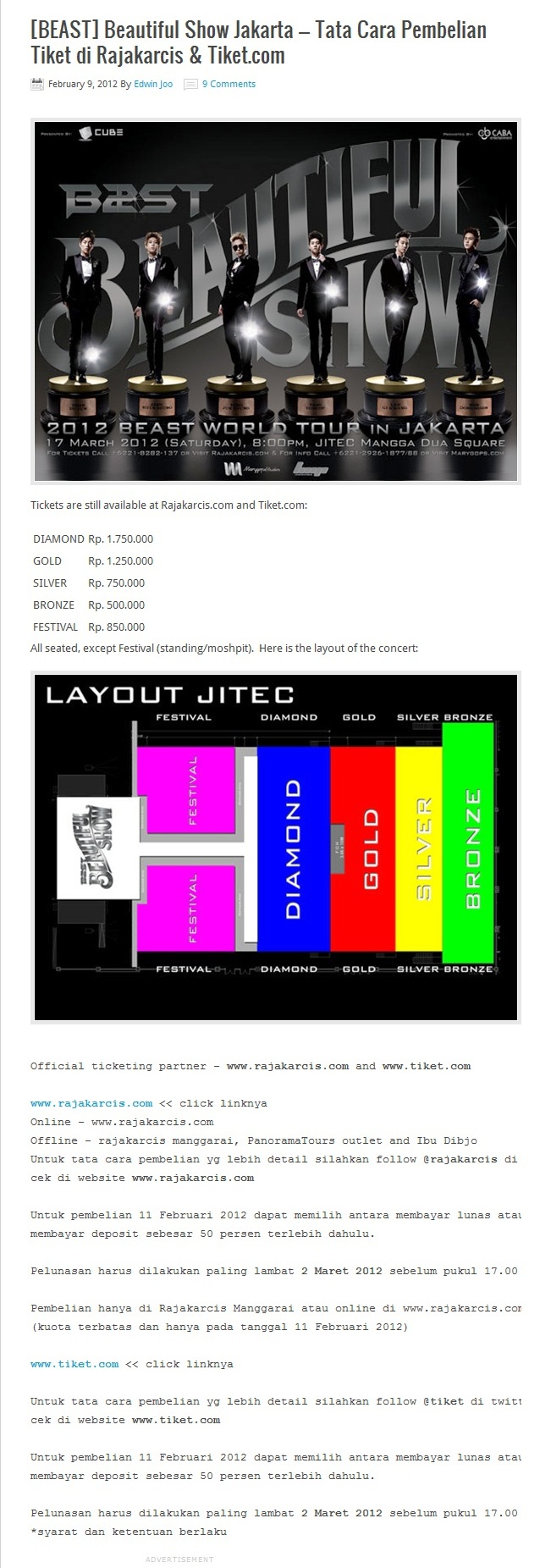 비스트 월드투어, 자카르타 콘서트 티켓판매 정보입니다. 댓글1개