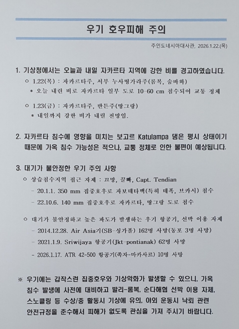 ※ 우기에는 갑작스런 집중호우와 기상악화가 발생할 수 있으니, 가옥 침수 발생에 사전에 대비하고 발리-롬복, 순다해협 선박 이용 자제, 스노클링 등 수상/중 활동시 기상에 유의, 야외 운동시 낙뢰 관련 안전규정을 준수해서 피해가 없도록 관심을 가져 주시기 바랍니다.
