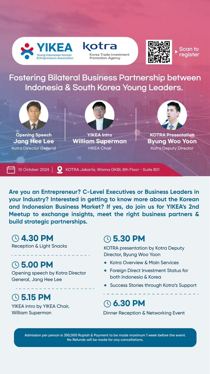 KOTRA 소개와 성공 사례를 공유를 통해 인도네시아와 한국의 젊은 리더들이 비즈니스 파트너십을 구축할 수 있도록 돕기 위해 YIKEA (Young Indonesian Korean Entrepreneurs Association)와 KOTRA 공동 주최로 ‘인-한 영 리더 비즈니스 파트너십 강화 포럼’을 개최합니다. KOTRA 발표 이후, 참석자들에게 상담 세션이 제공될 예정입니다.