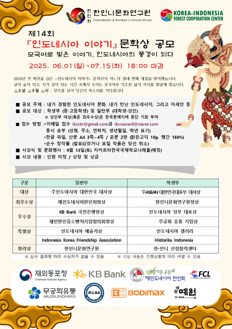 ■ 시상식 및 문화행사 : 9월 13일(토) 자카르타한국국제학교나래홀(예정)