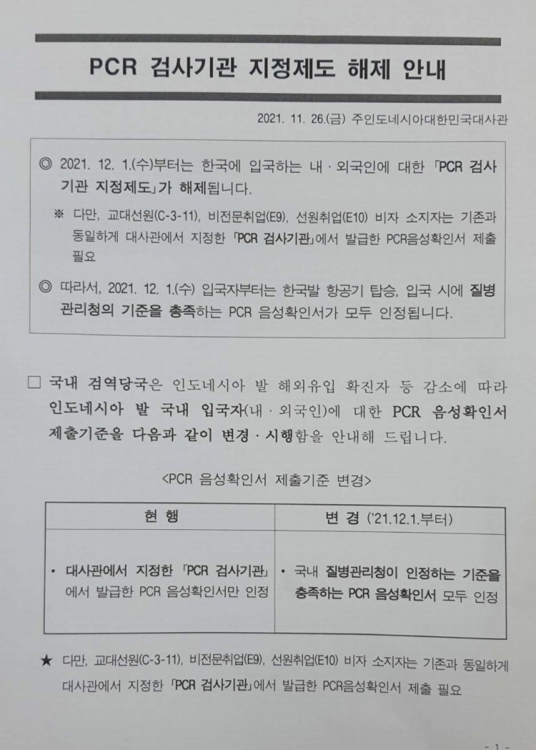 인니에서 한국 입국 시, 양성확진자가 다수 발생하면서 PCR 음성 검사서의 진위여부나 그 안정성을 강화하는 측면에서 지정된 제도이나 지방의 업체나 지정기관에서 받기 위해서 이동이나 비용 등의 문제가 된 바 이 역시 교민들의 입장에서는 환영할 만한 결정 이므로 향후 한국 입국 시 참고 하시기 바랍니다.