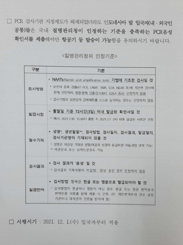 그 동안은 한국 대사관등에서 지정한 병의원이나 기타 기관에서 발급받은 PCR 허가만 유효하였으나 이제 인도네시아 국가 질병관리청에서 공인된 병의원이나 기관에서 발급된 모든 PCR음성 확인서로 입국이 가능합니다.