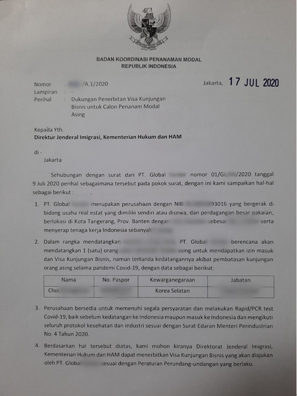 아직 인도네시아는 일일 코로나 확진자가 일 평균 1,600여명을 상회하는 가운데인니 정부는, 조심스럽게 신 뉴노멀 정책을 시행하고 있으며, 투자청의 신규비자는 국가 주요 프로젝트나 주요 사업에 한해 투자청에서 심사하여 비자 발급을 받을 수 있는 보증서를 발급해 주고 있습니다.