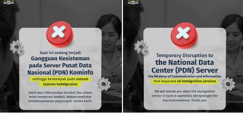 인도네시아 일부 정부의 행정망과 기타 공항출입국 업무와 이민국업무 등이 8일간 지연 되었으며 “실미 카림(Silmy Karim) 이민국장(Dirjen)” 은 지난주 PDN 서비스 중단 이후 이민 서비스 복원 과정이 단계적으로 진행되었다고 밝혔으며. 6월 28일 금요일 Kompas.com 에서 인용한 그는 "오늘 우리는 모든 이민 서비스, 온라인 비자, 거주 허가증 및 여권이 100% 복구 되었음을 확인했습니다 "라고 말했습니다. 실미는 또한 출입국 서비스, 특히 여권의 전체 복원 과정에 많은 노력이 필요했기 때문에 서비스가 꽤 오랜 시간에 걸쳐 복원되었다고 밝혔습니다.