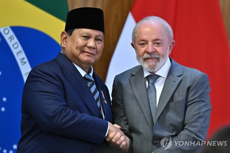 (브라질리아 EPA=연합뉴스) 9일 브라질 브라질리아에서 프라보워 수비안토 인도네시아 대통령(왼쪽)과 루이스 이나시우 룰라 다시우바 브라질 대통령이 악수하고 있다. 2025.7.10 photo@yna.co.kr