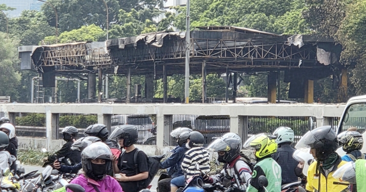 (자카르타=연합뉴스) 손현규 특파원 = 지난 1일(현지시간) 인도네시아 수도 자카르타 중심부인 스나얀에 들어서자 차창 밖으로 완전히 불에 탄 버스 정류장이 먼저 보였다. 평일에도 많은 승객이 모이는 곳이지만 뼈대만 남은 채 흉물이 돼 있었다.