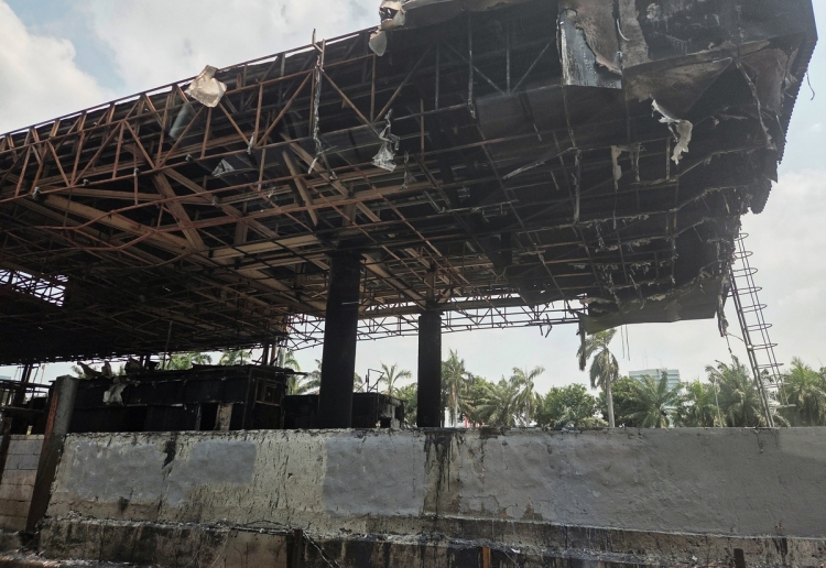 (자카르타=연합뉴스) 손현규 특파원 = 지난 1일(현지시간) 오후 인도네시아 수도 자카르타 중심부 스나얀에 있는 국회의사당 인근 고속도로 요금소 건물이 며칠 전 시위대 방화로 불에 탄 채 방치돼 있다. 2025.9.2