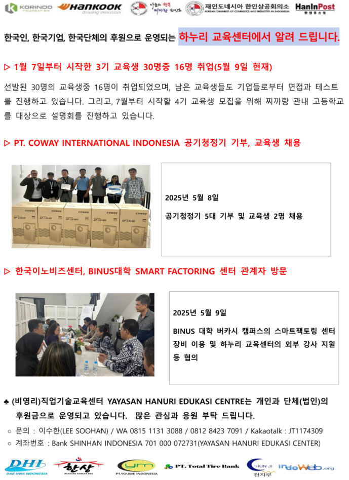 ♣ (비영리)직업기술교육센터 YAYASAN HANURI EDUKASI CENTRE는 개인과 단체(법인)의 후원금으로 운영되고 있습니다. 많은 관심과 응원 부탁 드립니다.