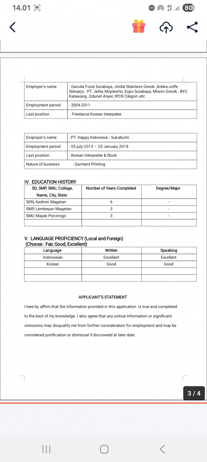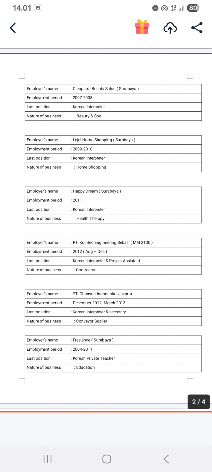 안녕하세요 한-인 통역사 리아라고합니다 한구말을 한국에서 배웠습니다 5 년 동안 한국에서 경기도 광주시 에 일했습니다 한국 갔다와서 인도네시아에 있는 한국 회사를 통역사로 근무했습니다 통역사 알바도 많이했습니다 통역사 필요하신분들 계시면 WA 나 카톡 으로 연락 주십시오 감사합니다 |
