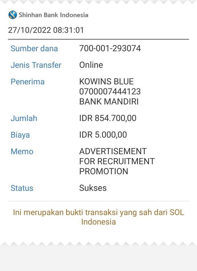 입금일, 입금 은행(BCA, Mandiri, 농협, 국민 중 하나), 금액