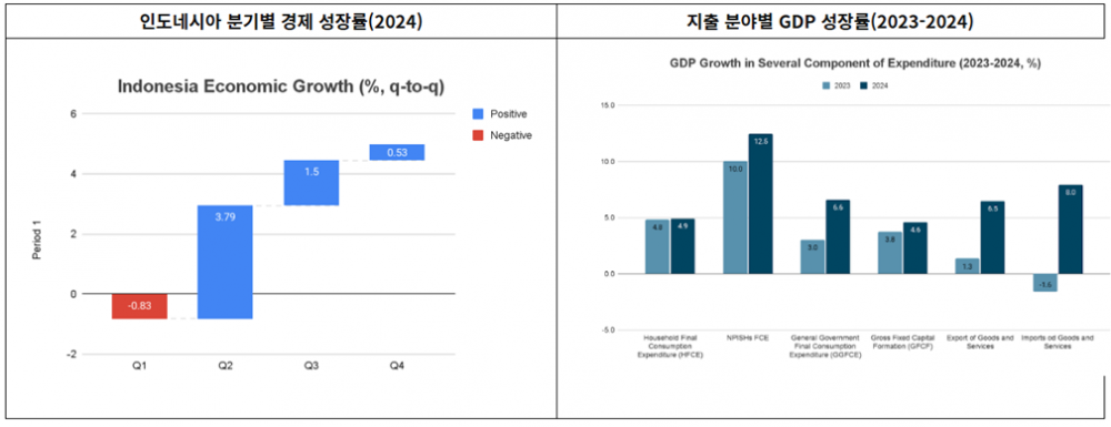 인도네시아 통계청에 따르면 2024년 인도네시아 경제는 5.03% 성장하여, 3년 연속 5% 대 성장률을 기록하였다. 1분기에는 0.83% 감소하였으나, 2,3,4 분기에 잇달아 성장하였으며 최종적으로 5.03%의 성장률을 보였다. 인도네시아 경제는 비영리기관 가계지출소비 부분이 약 54.0%로 가장 큰 비중을 차지하고 있으며, 총고정 자본형성이 29.2%, 수출이 22.2%, 정부지출이 7.7% 순이다.