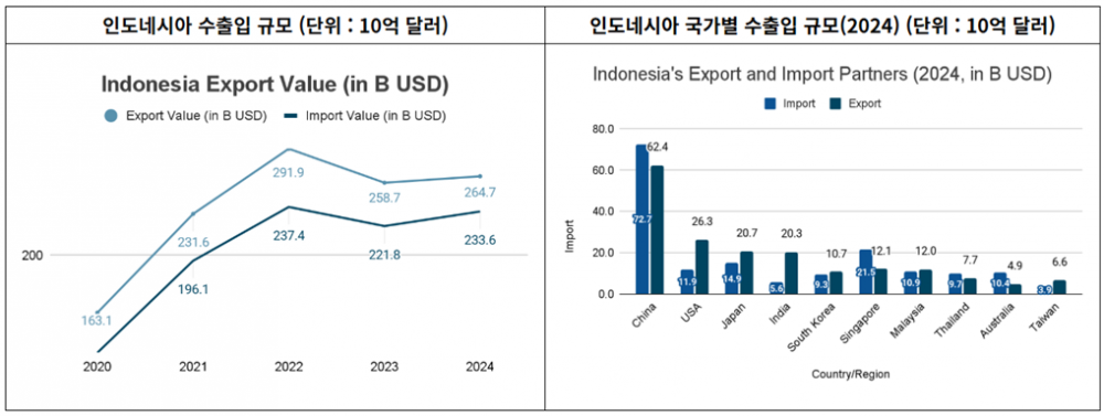인도네시아 통계청(BPS)에 따르면, 2024년 인도네시아의 수출액은 2,647억 달러로, 2023년 같은 기간 대비 2.3% 증가했다. 수출 증가의 주요 요인은 농업, 임업, 수산업 분야가 성장했으며, 비석유·가스 부문에서는 기초금속의 수출이 증가했다. 인도네시아의 최대 교역국은 중국으로, 교역 규모는 1,351억 달러에 달한다. 그러나 중국과의 무역에서는 103억 달러의 적자를 기록했으며, 이는 인도네시아가 중국의 산업재 및 자본재에 크게 의존하고 있음을 시사한다. 반면, 미국과 인도는 인도네시아의 주요 수출 시장으로 부상했으며, 각각 144억 달러와 147억 달러의 무역 흑자를 기록했다. 인도와의 높은 흑자는 석탄 및 팜유 수출에 의해 주도된 것으로 보이며, 미국 시장에서는 인도네시아산 섬유, 팜유, 해산물 등에 대한 수요가 증가하였기 때문으로 보인다.