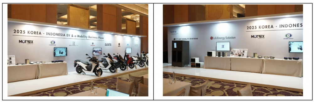 행사장 내 EV 쇼케이스에는 한국과 인도네시아 참가기업 10개 사가 참여해 전기이륜차(EV2W)를 중심으로 주요 제품과 기술을 전시했다. 전시 품목은 배터리 교환 시스템(BSS), 전기이륜차 완성차, 배터리팩, 속도계, 배선 시스템, 보조 배터리, 충전기 등으로 구성됐으며, EV 부품 생산부터 조립, 배터리 재사용·재활용에 이르는 전주기 솔루션이 포함됐다.