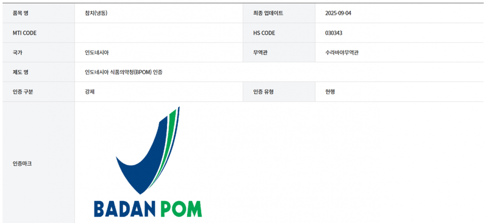 ㅇ 인도네시아로 수입되는 모든 냉동 수산물 경우 위생상태, 첨가물에 대한 정부 통제, 유전적으로 조작된 식품에 대한 통제, 국민건강을 위한 식품품질 유지 등을 이유로 인도네시아의 식약청(BPOM)으로부터 사전 인증을 획득해야함.
