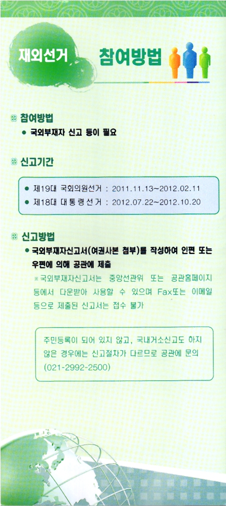 2012년 4월 11일 실시되는 제19대 국회의원선거와 관련하여 해외에서 투표를 하기 위해서는 아래의 사항에 따라 국외부재자 신고 등을 하여야 합니다.