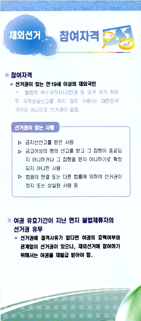 ※ 국내에 주민등록이 되어 있지 않고(주민등록 말소자 포함), 국내거소신고도하지 않은 19세이상 국민으로서 외국에서 투표하려고 하는 사람(재외선거인 등록신청 대상자)은 주인도네시아대사관에 문의(021-2992-3030, 재외선거관 : 0811-108-2357)