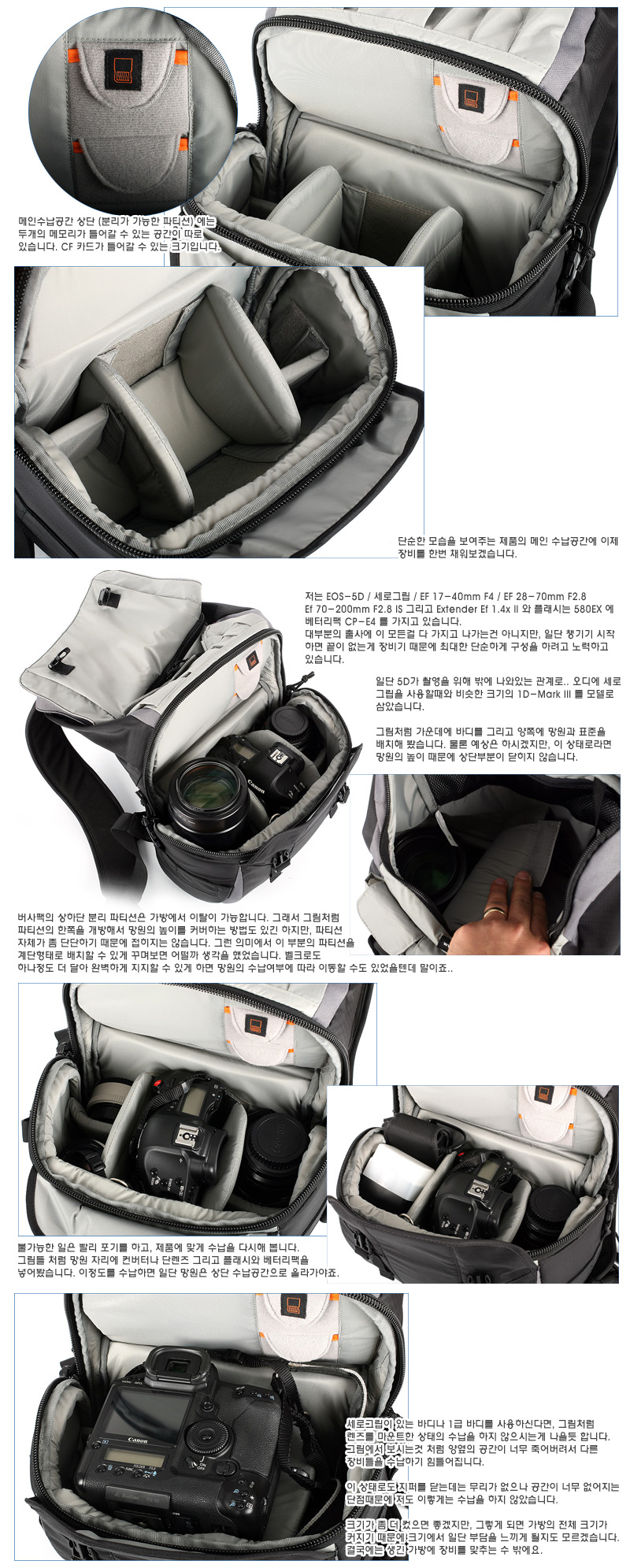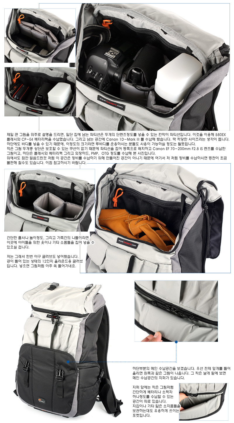 저는 장비가 많지 않아서 줌달린 카메라한대, 후레쉬, 방수카메라 한대 +삼각대거치+잡동사니 넣을공간 이
