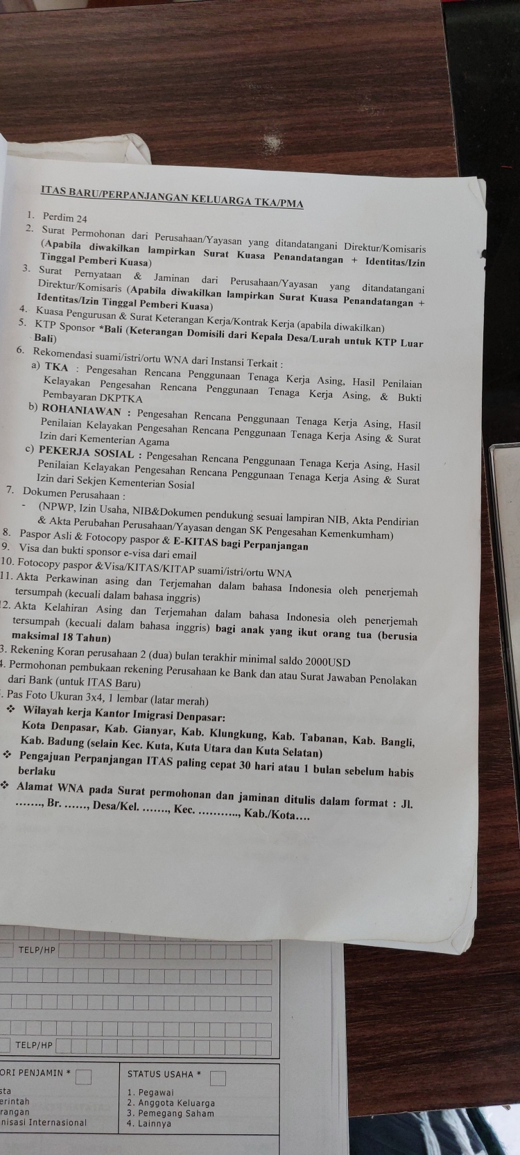발리 이민국에서 요청하는 전체 서류 목록은 사진으로 첨부했고요, 그중 다음이 헷갈립니다.