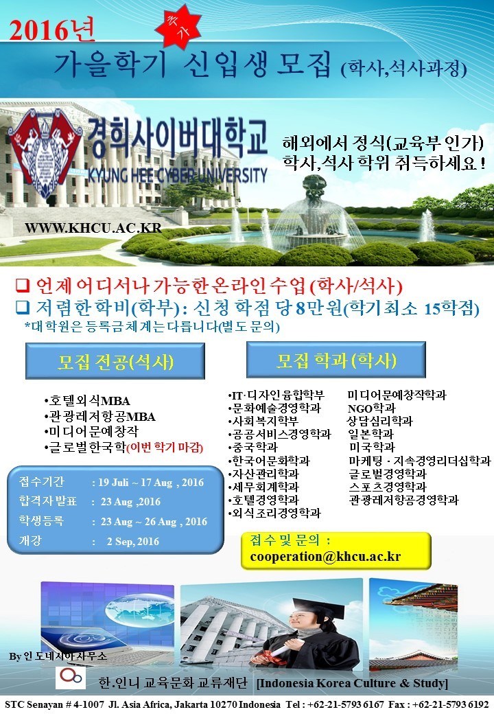 경희사이버대학교가 2016년 가을학기 추가 신입생 모집을 인도네시아에 계시는 여러분을