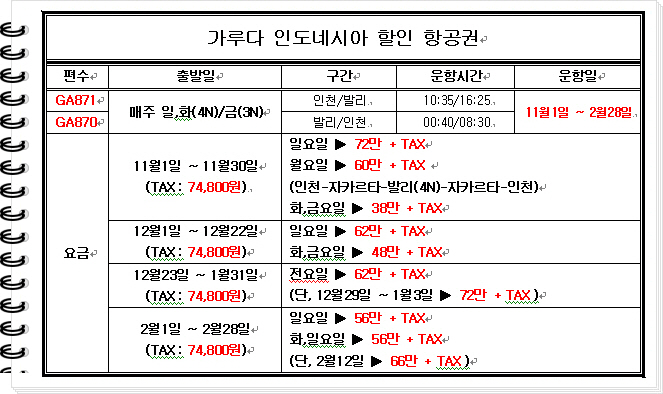 (GA)가루다항공 자카르타,발리,수라바야.. 특별요금
