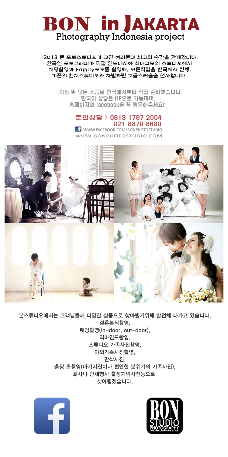 * 비용은 장소, 출사 인원, 촬영 내용에 따라 Rp.2,000,000 부터입니다.