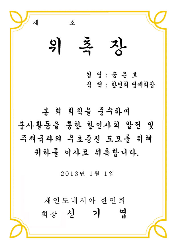 한인회 위촉장