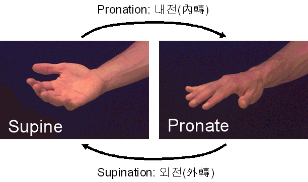 스트로크 뿐만 아니라 서비스 동작에서도 손목의 회전은 중요합니다. 흔히들 내전 내전 그러는데 내전(pronation)은 손목을 반시계 방향 (왼손잡이는 시계방향)으로 뒤트는 회전을 말합니다. 위의 그림에서 손바닥을 하늘로 향한 상태에서 땅을 향하도록 뒤집는 방향이 되겠습니다. 테니스에서 pronation 은 서비스 동작에서 많이 구사됩니다. 초보자들이 서비스를 넣으면 자연스럽게 라켓의 헤드가 왼무릎 쪽으로 향하는데, 그 결과 별다른 몸의 뒤틀림 없이도 슬라이스 서브가 저절로 형성됩니다. 하지만 팡팡 튀어오르는 탑스핀 서브 (동호인들 사이에서는 트위스트 서브라고 알려져 있지요)를 구사하기 위해서는 토스한 후 임팩트 순간에 라켓을 확 잡아채는 pronation 을 해 주어야 합니다.