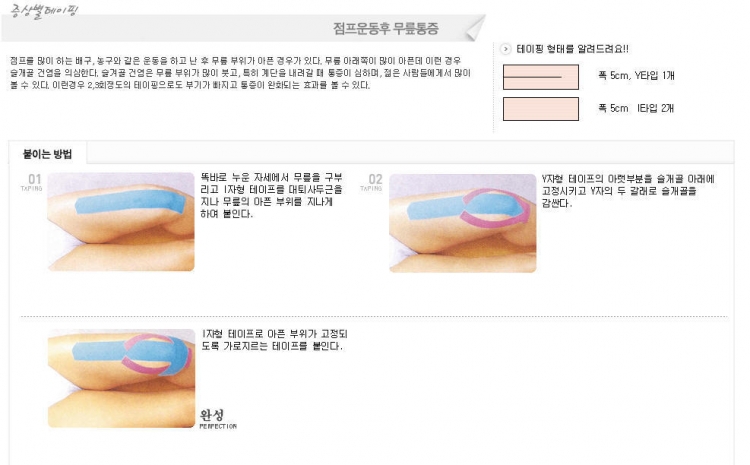 이와 같이 테이프를 붙여서 근육으로 인한 두통이나 목의 결림, 어깨 결림, 요통이나 무릎통증 또는 좌골신경통 등을 치료하는 것을 테이핑 요법이라 한다.