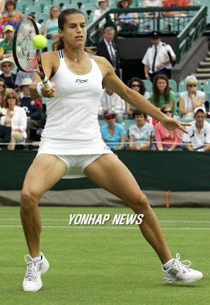 ■ 드롭샷을 치는 비결중의 하나는 라켓면을 살짝 오픈하고 공을 치는 것이다. 그리고 피니시 때 라켓 헤드가 땅과 거의 수평이 되도록 한다.