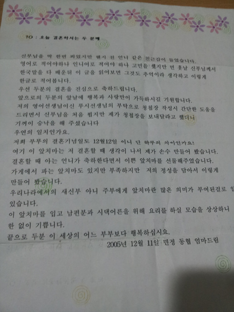 아, 참 아름다운 편지네요..그것도 앞 치마까지 선물을~~