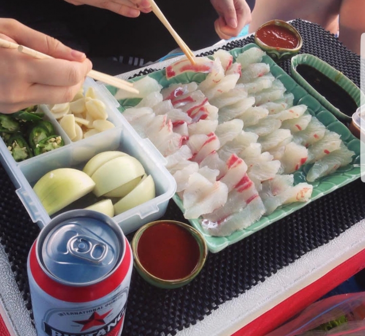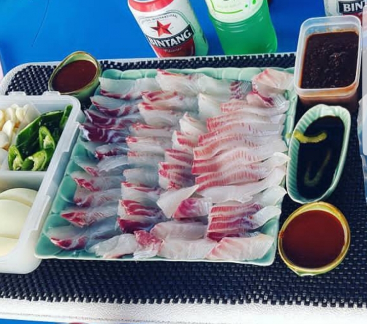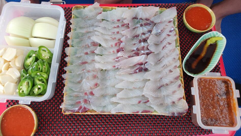 회크루즈는 맛있는 생선을 선별하여 작살총으로 잡아 물속에서 살아 있을 때 피를 뽑은 다음 바다에서 회로 떠드리므로 신선하여 회맛이 아주 좋습니다.
