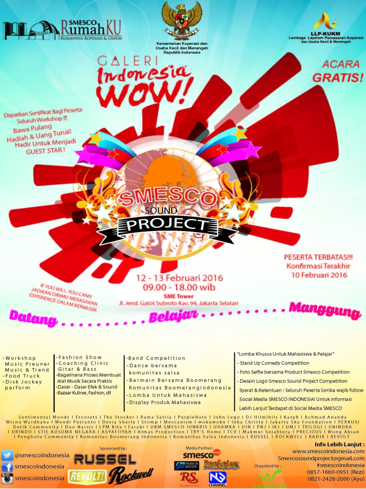 인도네시아 중소기업부(The Ministry of Cooperatives and SME's)는 SMESCO Indonesia를 통해 "SMESCO Sound Project"를 개최합니다.