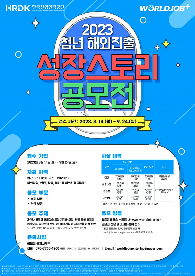 문화/행사/기타 | [한국산업인력공단] 2023 청년 해외진출 성장스토리 공모전 모집 (~9/24)