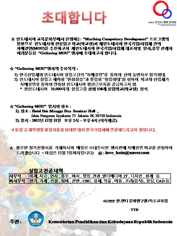 인도네시아 교육문화부 실업고국에서 각 실업고와 한국기업및 사업체와의 "자매결연(MOU)"를 연결하여