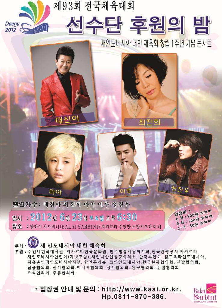 이번 “제93회 전국체육대회 후원의 밤 콘서트”는 재인도네시아 대한체육회 선수단 파견 비용 일부의 조달을 위한 후원 콘서트입니다.