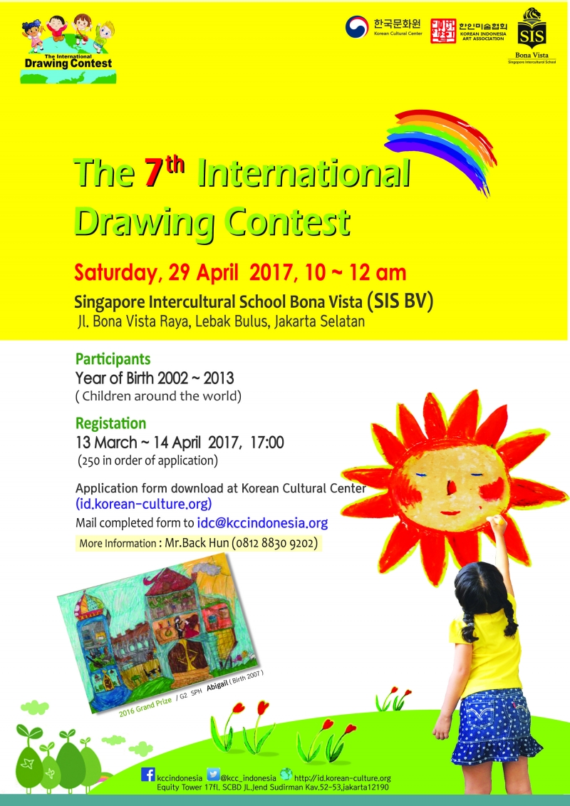 제7회 국제사생대회는 2002년부터 2013년 사이에 태어난 어린이가 참가할 수 있으며, 신청은 3월 13일부터 4월 14일까지 주인도네시아 한국문화원 홈페이지(http://id.korean-culture.org)에서 신청서 양식을 받아 이메일로 신청할 수 있다. 수상작 발표는 5월 4일 한국문화원 홈페이지를 통해 발표되며, 시상식은 5월 13일(토) 한국문화원 다목적실에서 개최될 예정이다.