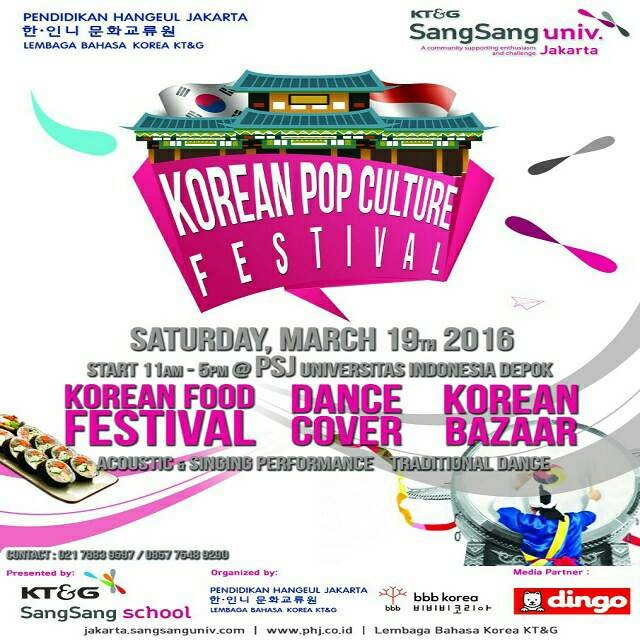 -저희 Korean Pop Culture Festival 행사에 오셔서 맛있는 한국음식도 드시고, 인도네시아친구들의 한국노래커버 및 댄스커버경연대회도 함께 즐기시길바랍니다. 이밖에도, 한국 전통물품 만들기, 한복입기, 한국과 인도네시아전통춤 공연도 함께진행될 예정입니다. 이번 행사가 인도네시아인뿐만아니라 한국인도함께 즐길수있는 문화교류적인 행사가될수있도록, 인니 교민여러분들의 많은관심과 참여부탁드립니다:)