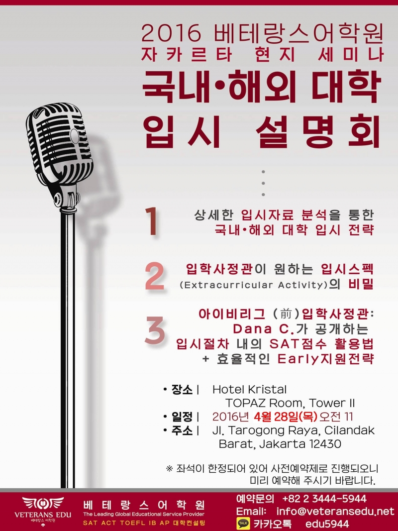 베테랑스어학원 국내/미국/아시아 대학입시설명회, 4/28(목)오전11시