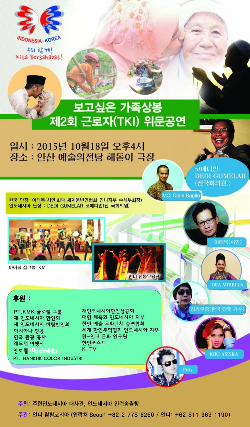 우리 대한민국의 근로자들이 가정과 나라를 세우기 위해 비지땀을 흘린일을 오늘 후손들이 기억하듯 멀지 않은 날 인도네시아 후세들에게도 오늘 저들의 노고가 기억 되길 기대하며 보고 싶은 가족 상봉과 "제2회 근로자(TKI)위문 공연"을 알려 드립니다.