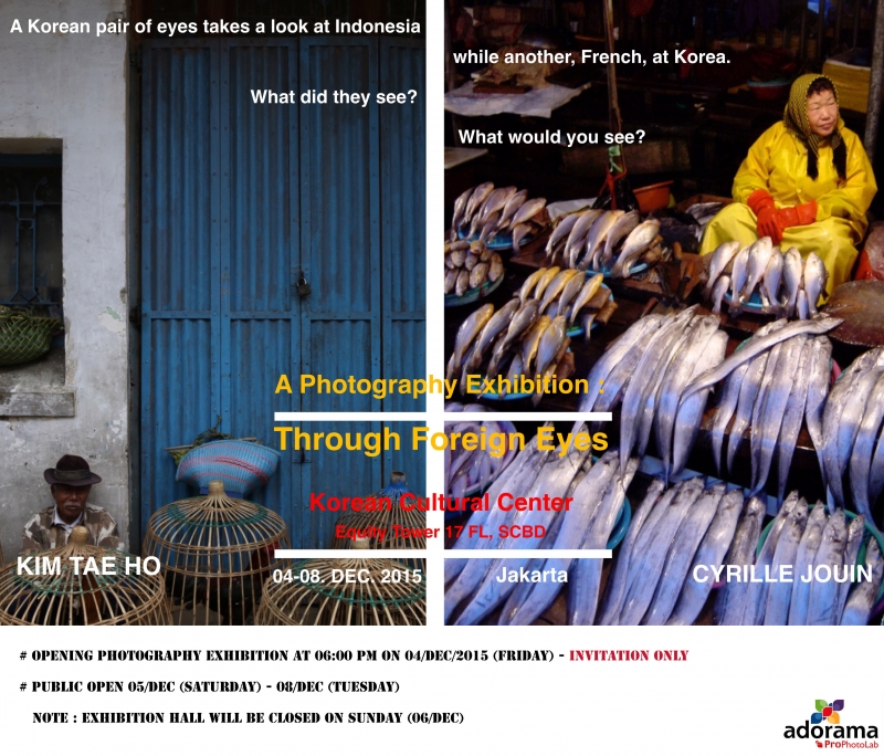 The concept of this exhibition is to share impressions from Indonesia and Korea as seen “Through Foreign Eyes”. A Korean pair of eyes for Indonesia and a French one for Korea. Over 100 pictures will be on display and we hope visitors can enjoy these and reflect on the way we look at or sometimes don’t see what is around us, including in our own countries.