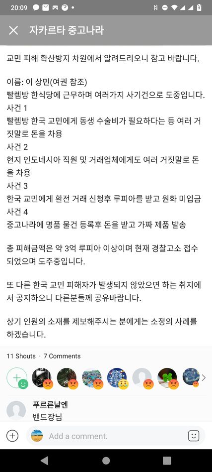좋아요 2 조심하세요. 한국에서 이상한 사람이 와서 피해를 끼치고 다닙니다… 댓글 7 개