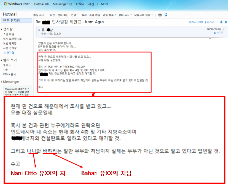 3. 2008년 당시 Mandiri 은행에 한국에서 투자한 회사 잔고가 남아 있었는데, 저를 사무실에서 내 쫓고, 그 은행 구좌에 출금정지를 시켰는데, 그 투자금은 저와 그 자(유XX)의 공동사인이 없으면 출금이 불가능한데, 저의 사인도 없이 찾아갔습니다. 그 돈에 대해 차후 한국 투자업체나 본인이 고발할 것에 대해 이를 은폐하기 위해서 저를 계속 괴롭히는 것입니다.