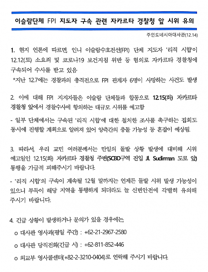 대사관소식 > 이슬람단체 FPI 지도자 구속 관련 자카르타 경찰청 앞 시위 유의