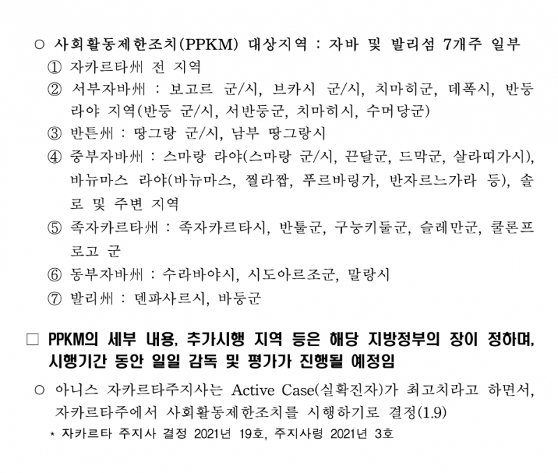 코로나 19 확산 방지를 위한 사회활동제한조치(PPKM) 실시