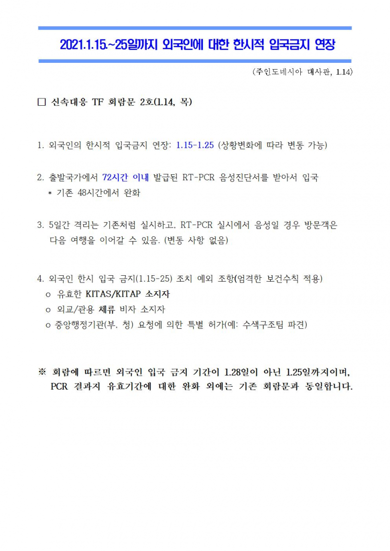 외국인 입국 금지 연장(2021.01.15-25까지)