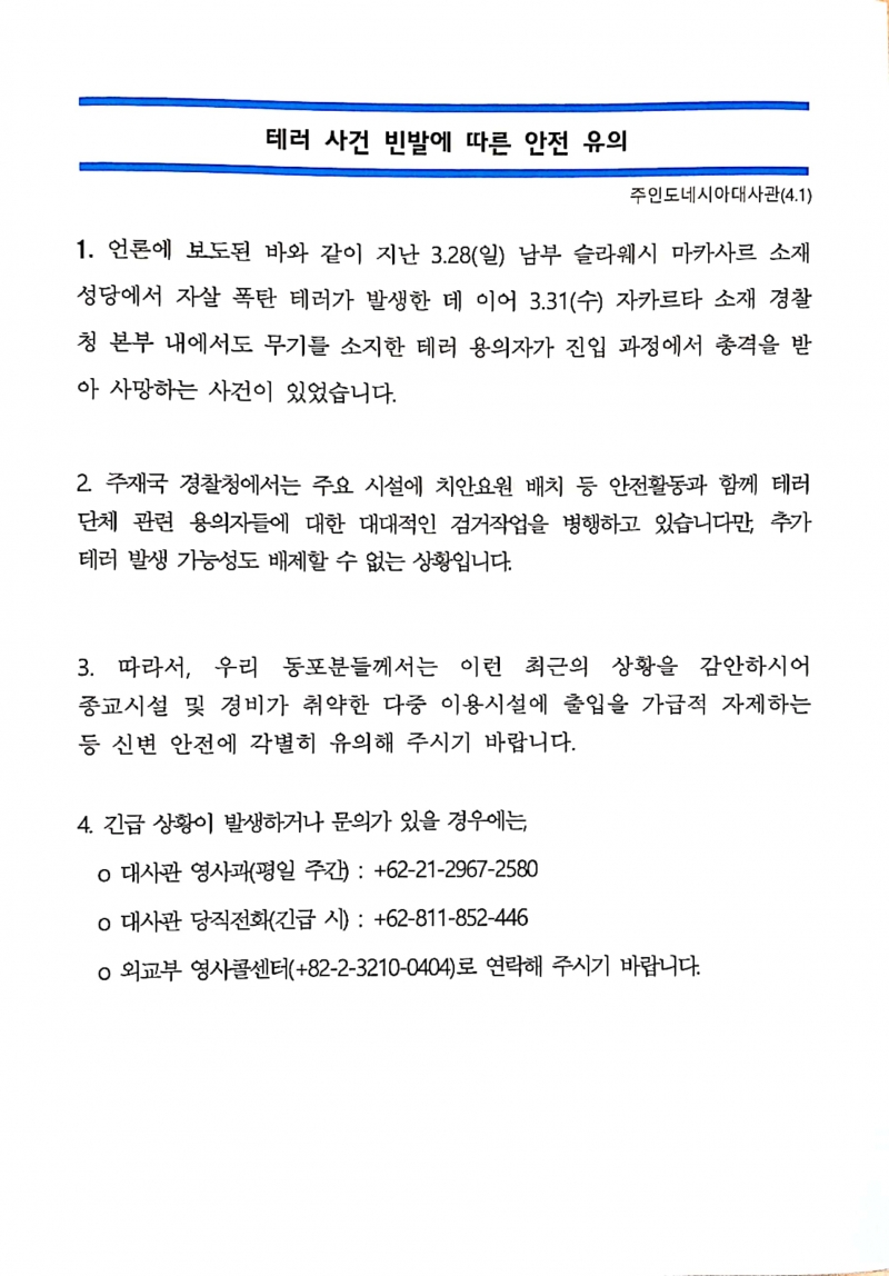 대사관소식 > 테러 사건 빈발에 따른 안전 유의 (4.1.)