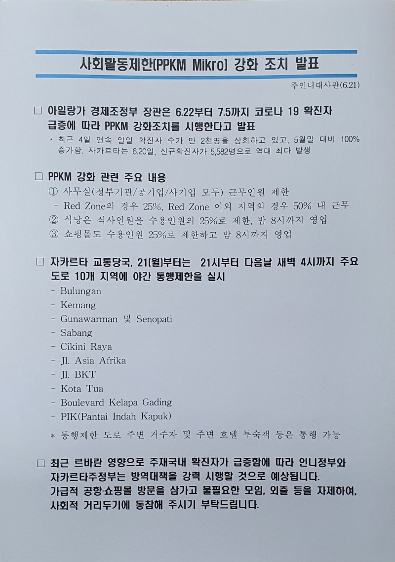 대사관소식 > 사회활동제한(PPKM Mikro) 강화 조치 발표 (6.21)