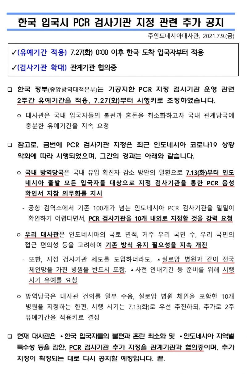 한국 입국시 PCR 검사기관 지정 관련 추가 공지