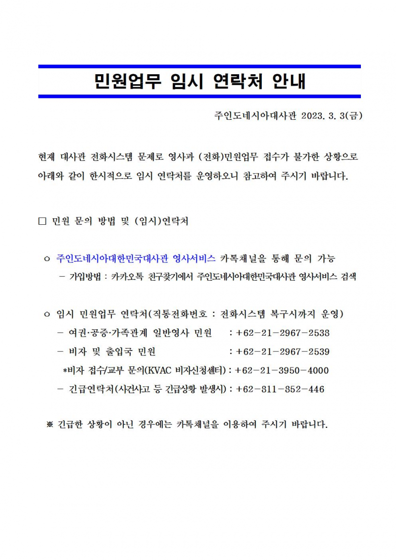 영사민원 임시연락처 안내(2023.03.03 부터)
